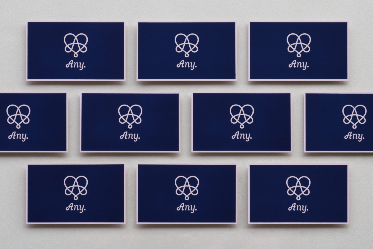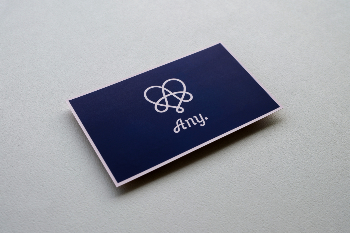 ゲームやアパレルの企画・プロデュースを手掛ける株式会社Anyのブランドロゴをデザインしました。リクエストのあったモチーフである「ハート」と「A」をひとつなぎに繋げ、ループするシンボルマークを作りました。いつでも、なんでも、とにかくやってみる というコンセプトが伝える挑戦の連鎖を、いつまでも続くかたちで表現しています。