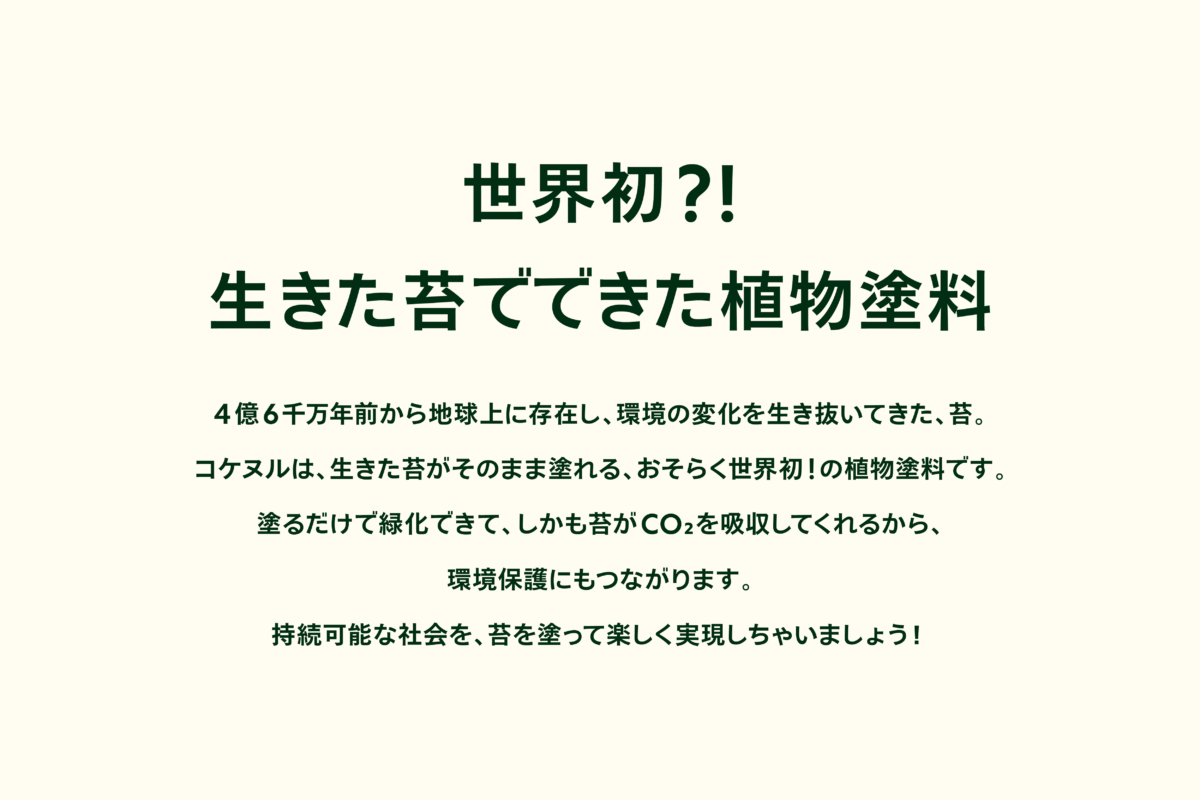 ▶︎プレスリリース「石油の代わりに、コケを塗る時代へ!日本初※の植物塗料「コケヌル」発売!」 https://prtimes.jp/main/html/rd/p/000000002.000172111.html